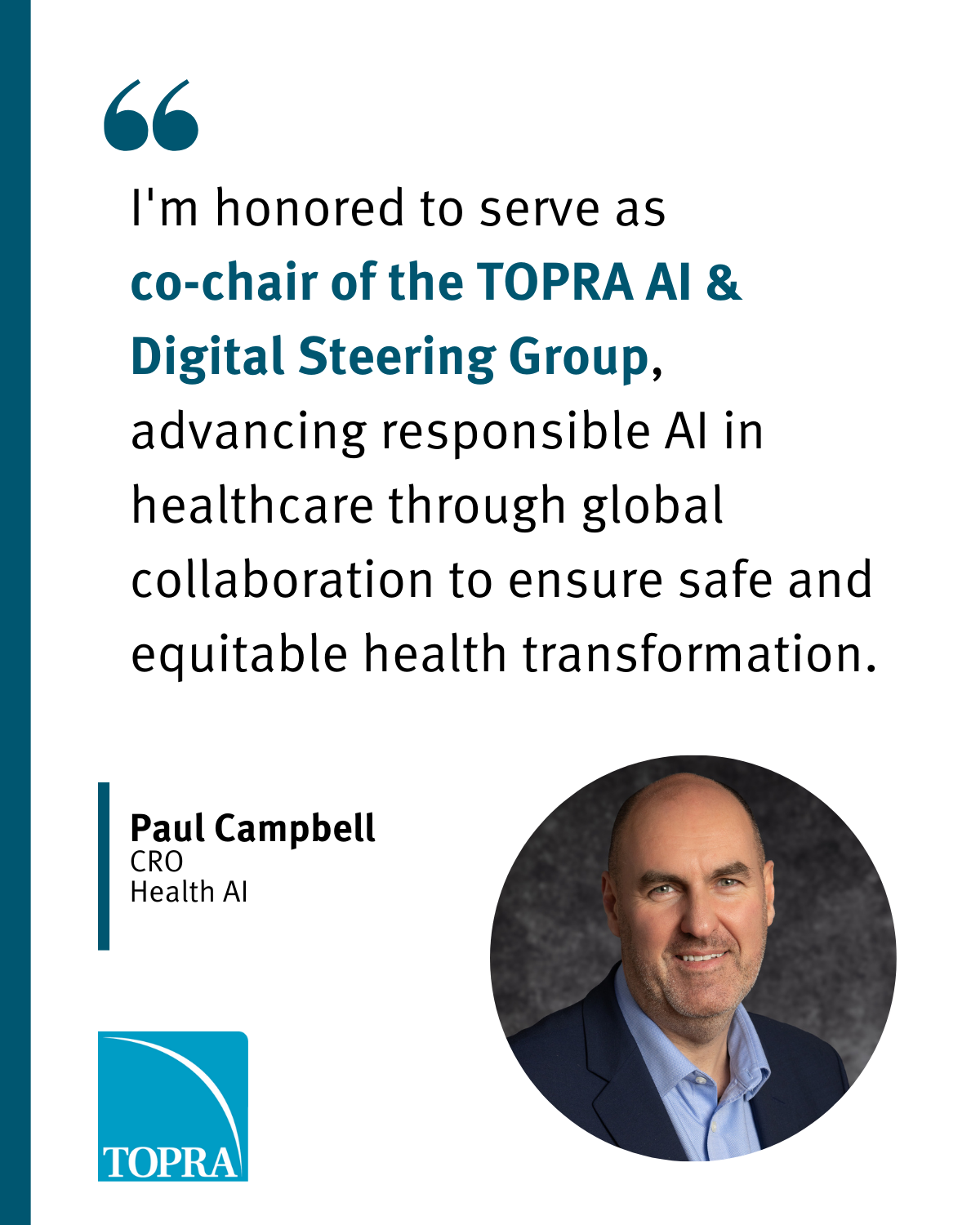 “I am honoured to serve as the co-chair of the TOPRA AI & Digital Steering Group, advancing responsible AI in healthcare through global collaboration, to ensure safe and equitable health transformation.
